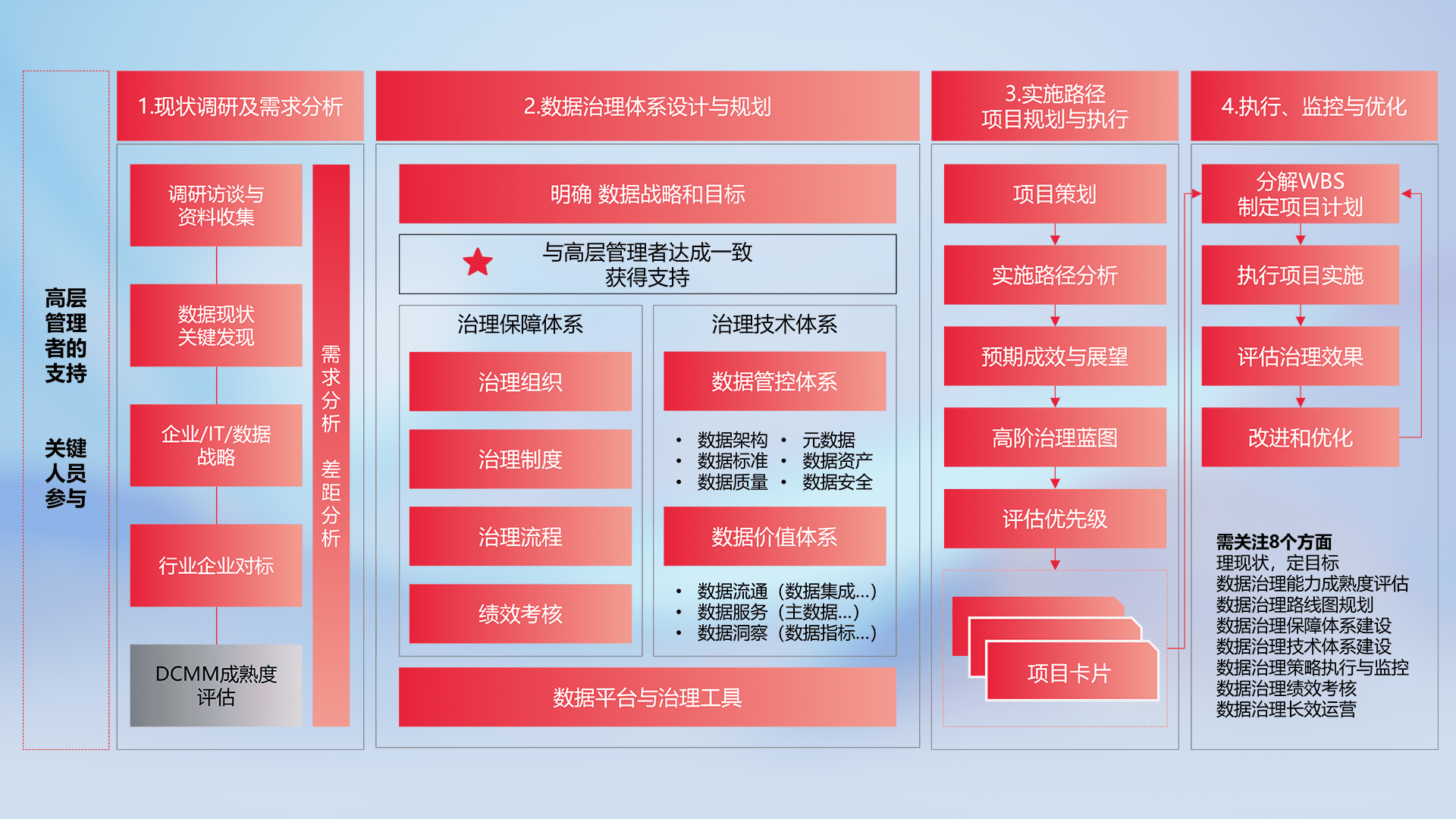 制定并执行统一的数据标准,,,规范数据定义和格式,,消除冗余和不一致性,,,,实现跨部门和跨系统的数据一致性,,,为企业提供标准化的数据基础。。